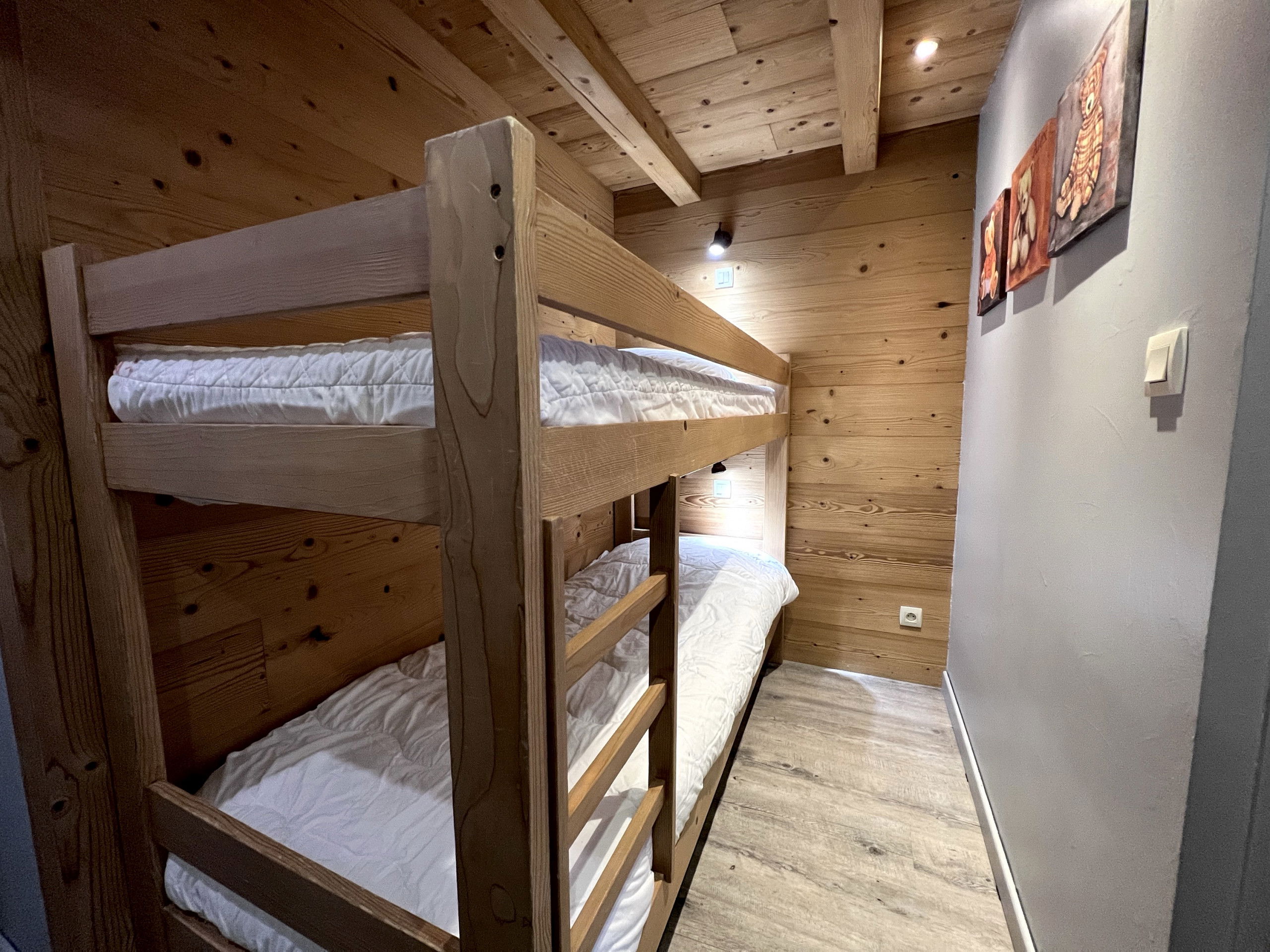 ENTREE: (sol PVC) placard-penderie, avec COIN MONTAGNE, 9,42 m2, 2 LITS superposés (80), une porte coulissante vitrée sépare l'entrée du séjour,