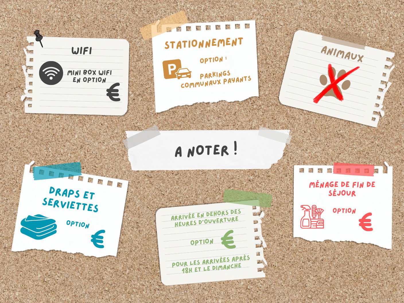 CHAUFFAGE CENTRAL COLLECTIF - PLACARDS A SKIS - 4 COUVERTURES pour lits doubles et OREILLERS FOURNIS - DRAPS, TAIES D’OREILLER ET SERVIETTES NON FOURNIS (service en supplément) - Parking public communal (abonnement semaine) - ANIMAUX admis sur autorisation +25€ - WIFI option payante sur commande (7€ par jour et 39€ pour la semaine).