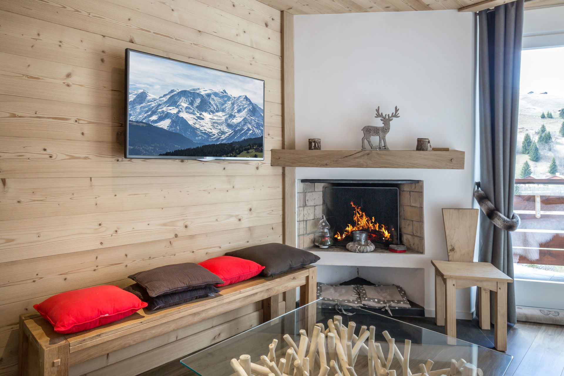 - SEJOUR (17.88 m²) : coin repas, salon, TV écran plat, CHEMINEE, fenêtre + porte-fenêtre, petit balcon sud, vue montagne