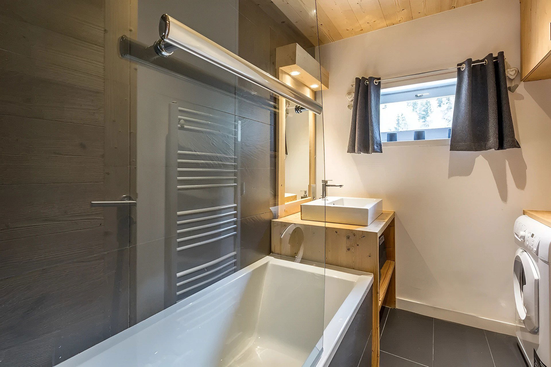 - SALLE DE BAINS (4.23 m²) : vasque, baignoire, radiateur SECHE-SERVIETTES, LAVE-LINGE SECHANT, fenêtre haute est