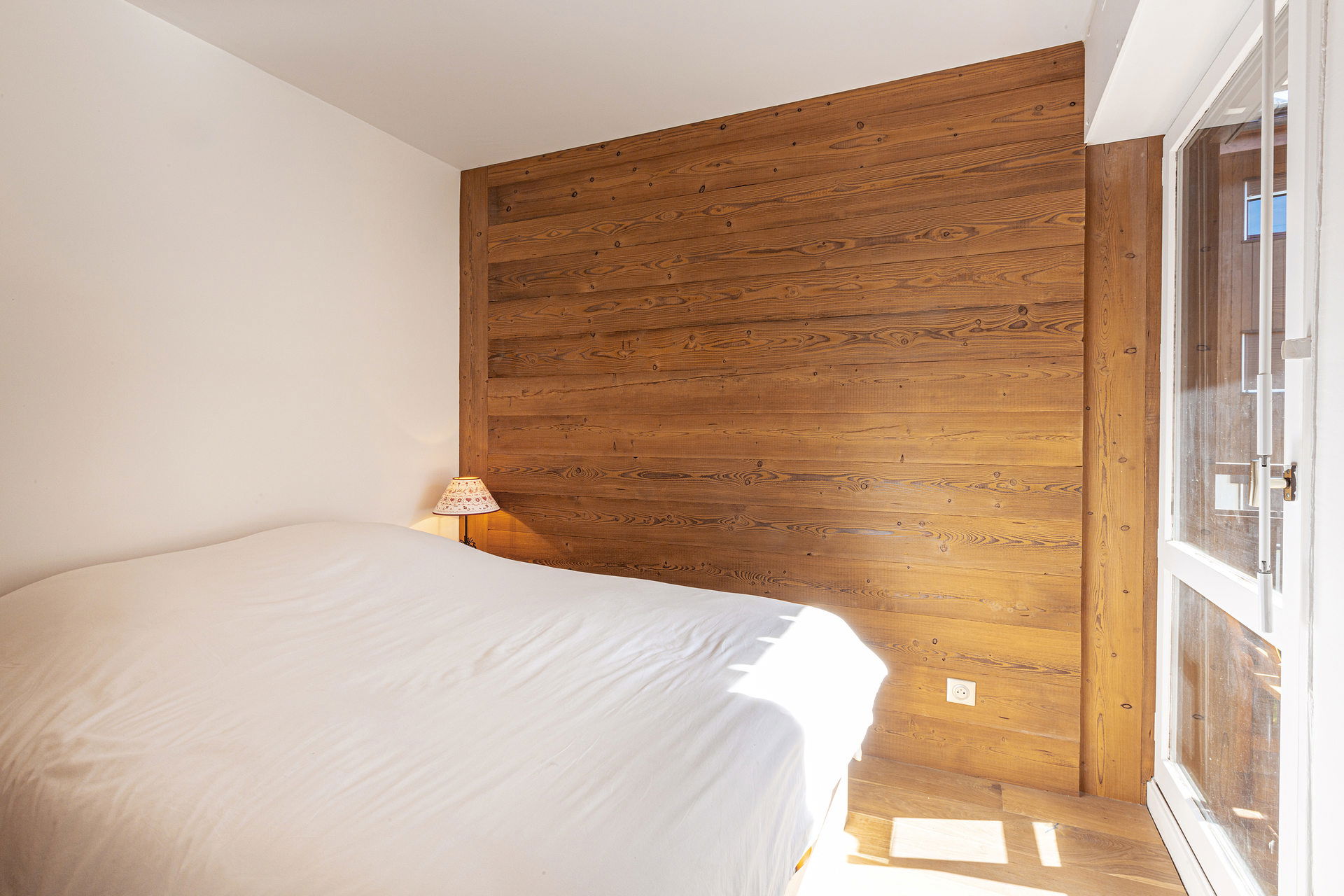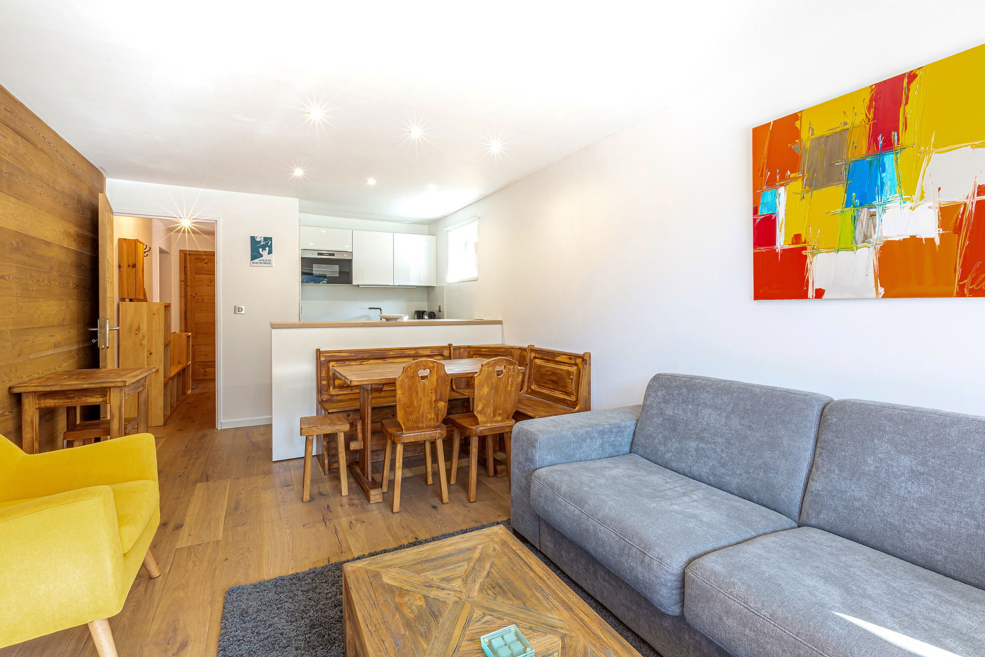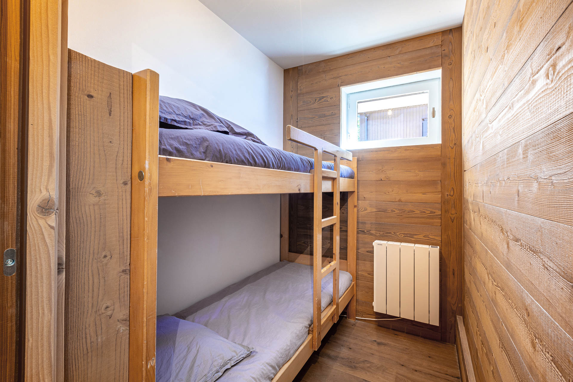 L’entrée, située au 1ᵉʳ étage, mène vers une première chambre dotée d’un lit double (140 cm) ouvrant sur un balcon exposé sud-est, et une seconde chambre accueillant 2 lits superposés (70 cm). Le séjour, lumineux, regroupe un coin repas et un canapé-lit (140 cm) dans une atmosphère chaleureuse. Une porte-fenêtre prolonge l’espace vers un balcon plein sud offrant une agréable vue sur les montagnes.