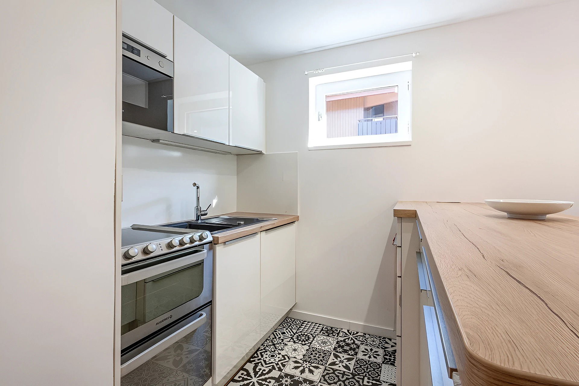 La cuisine ouverte, parfaitement intégrée à l’ensemble ainsi qu’une salle d’eau avec douche et un WC indépendant viennent compléter l’espace.