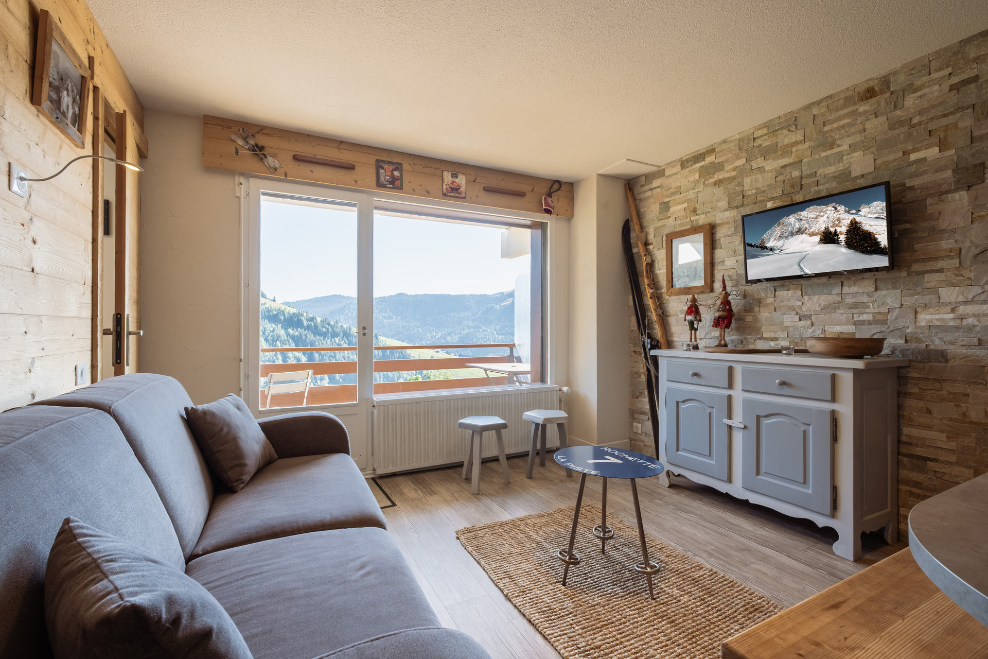 - SEJOUR (16.53 m²) : coin repas, TV écran plat, 1 CANAPE-LIT RAPIDO (140), baie + porte-fenêtre, accès balcon sud, vue chalets voisins / pistes / montagne