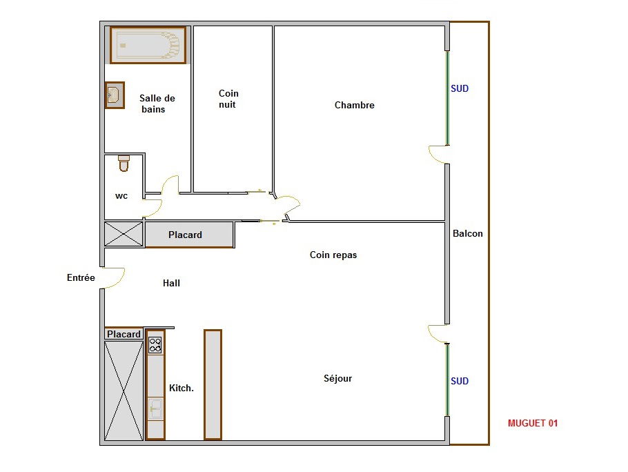 - SEJOUR (19 m²) : 1 CANAPE-LIT RAPIDO (140) , TV écran plat, baie coulissante, balcon sud, vue résidences voisines