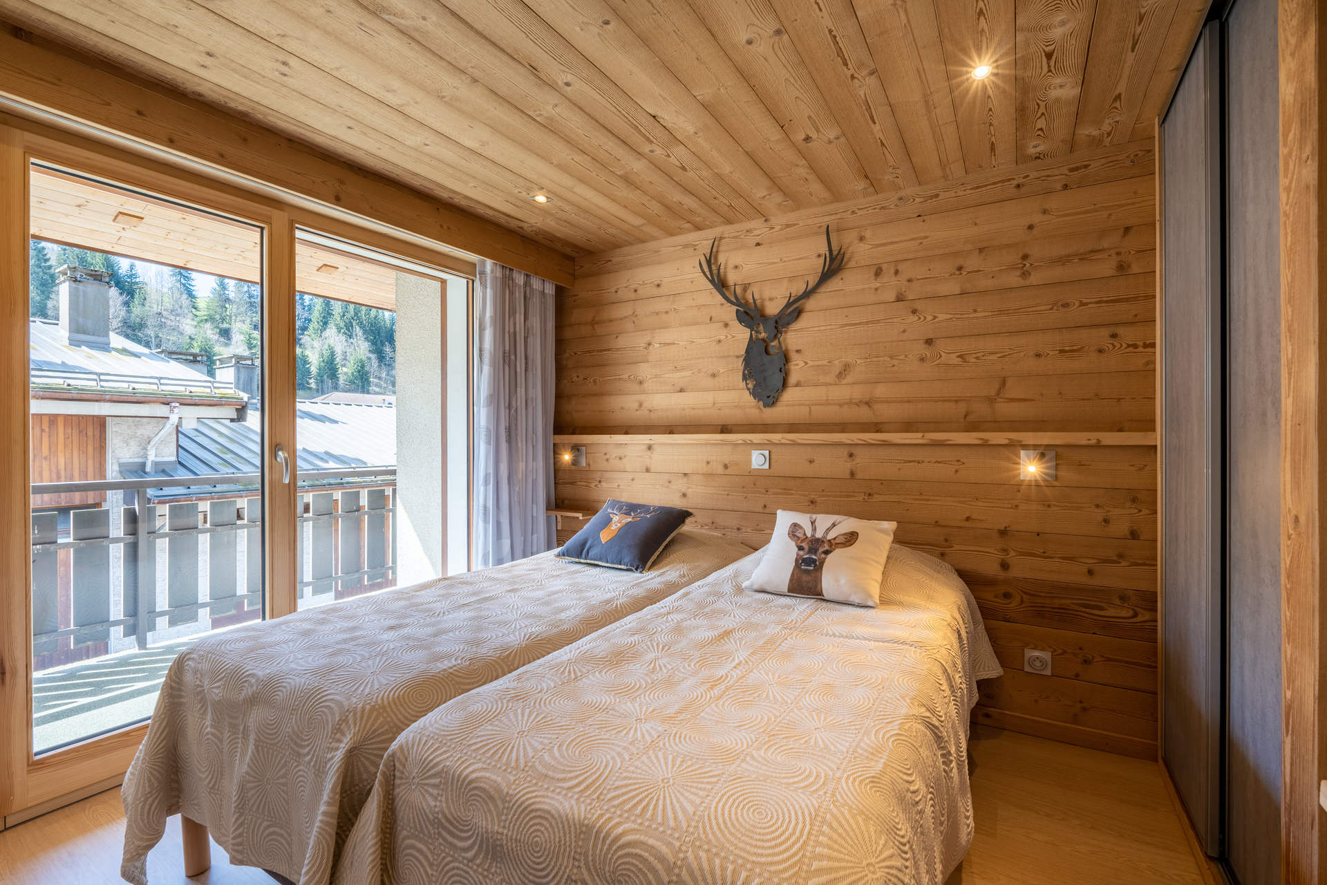 - CHAMBRE (10.28 m²) : 2 LIT 1 PLACE (80), baie + porte fenêtre, accès balcon sud, vue résidences voisines / pistes / montagne