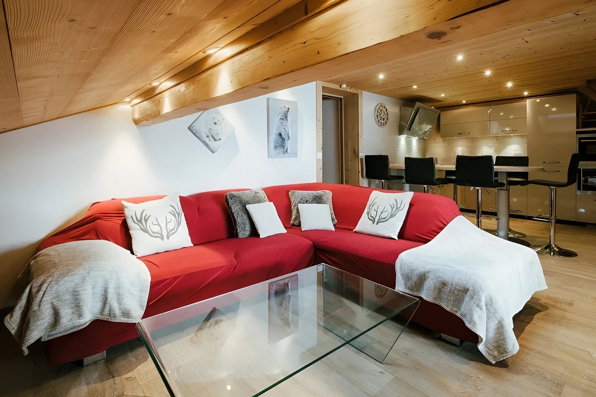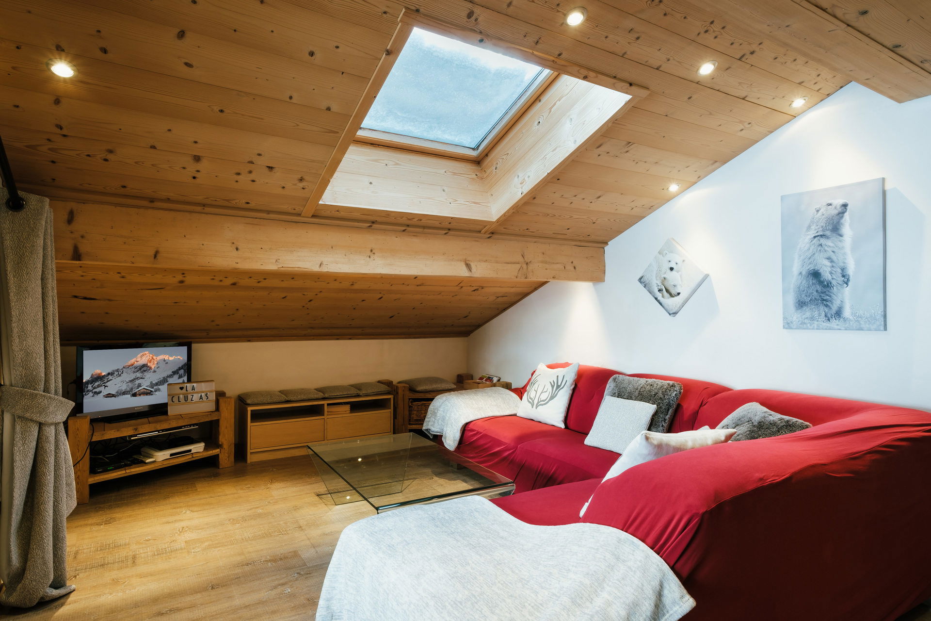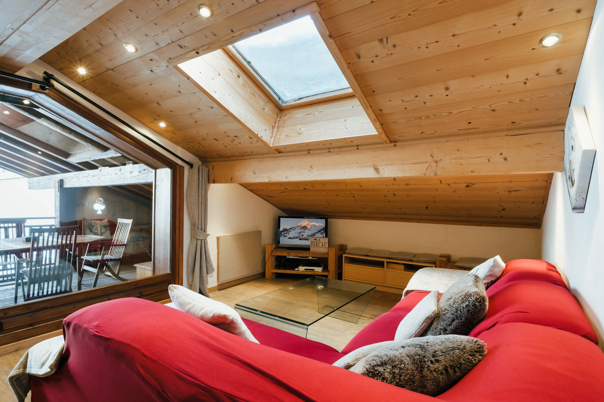 - SEJOUR (26.78 m² dont 7.46 m² mansardés) : coin repas et coin salon, TV écran plat, vélux, porte-fenêtre, terrasse mansardée couverte, vélux, est, vue station / montagne
