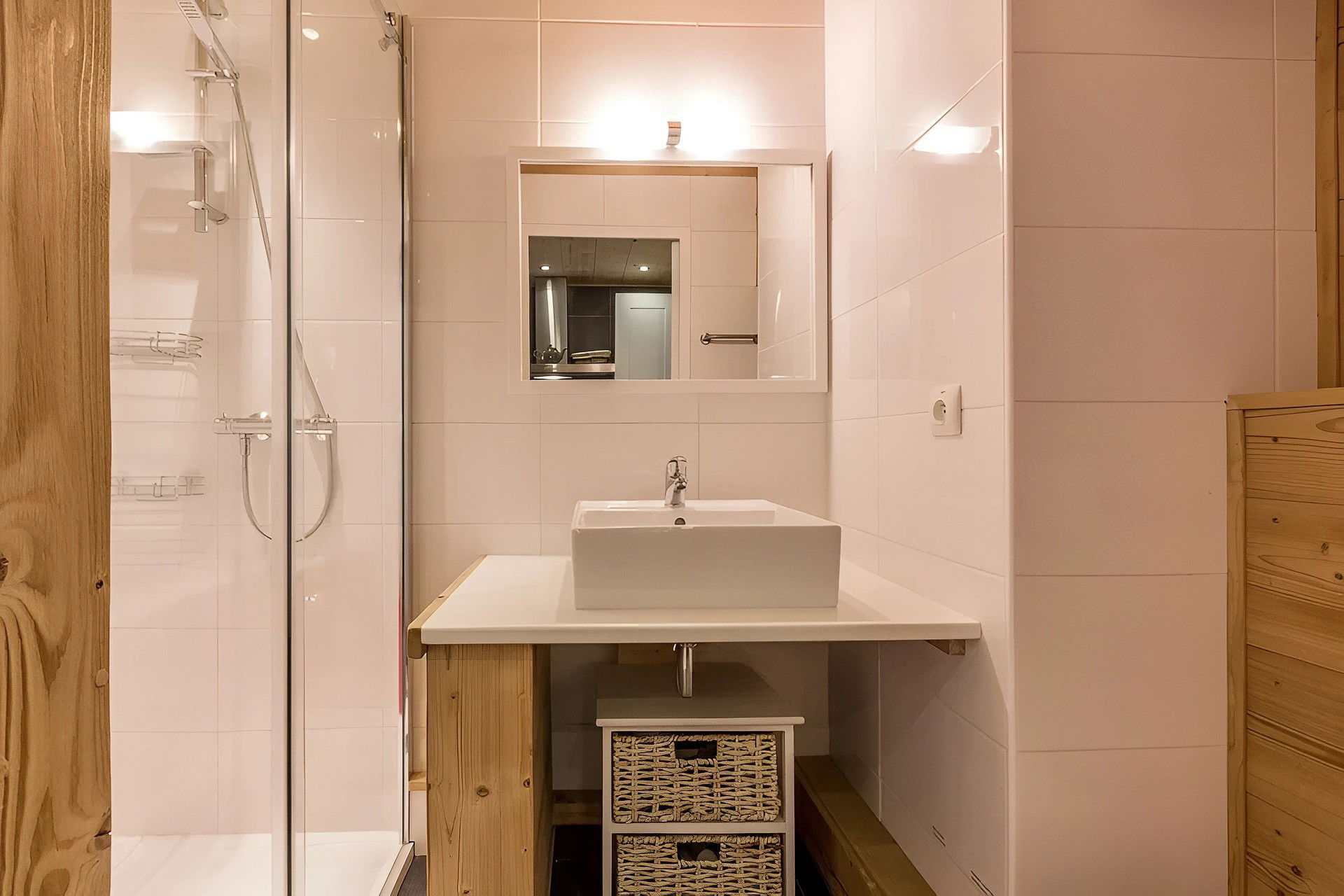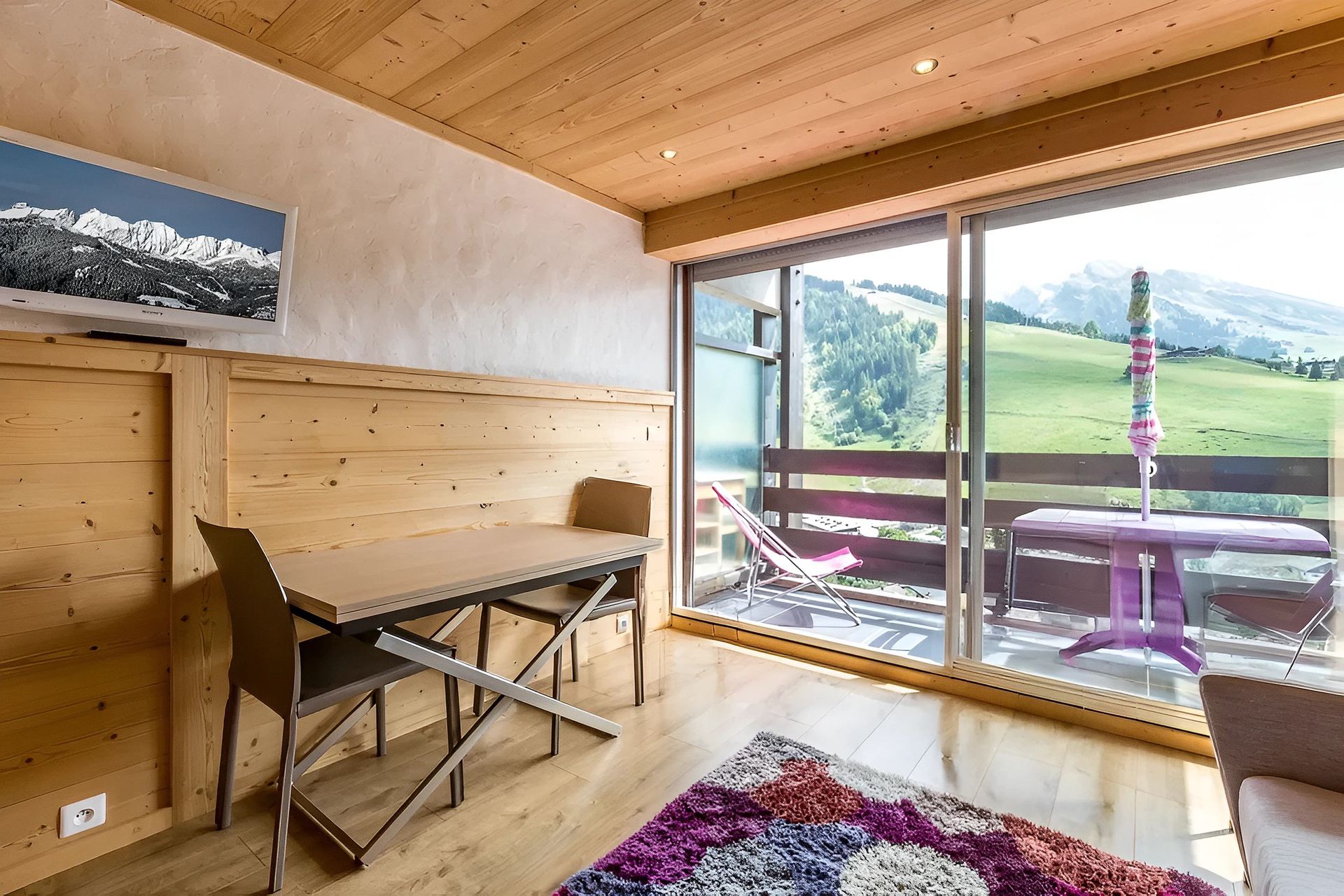 À l’extérieur, orienté plein sud, le balcon ouvre sur les montagnes et la station, apportant lumière et douceur tout au long de la journée.