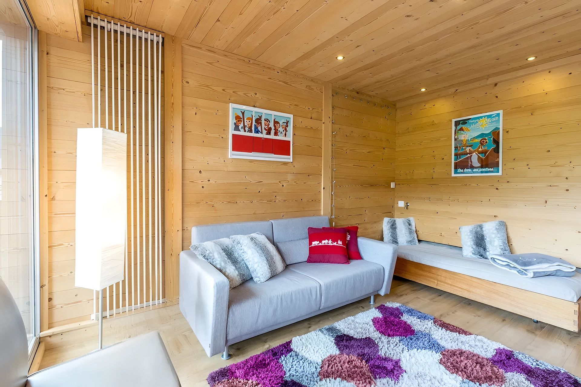 L’entrée, située au 2ᵉ étage, mène vers une cuisine fonctionnelle et ouverte, avant de rejoindre le séjour principal, lumineux et accueillant. Cet espace réunit un coin repas et un lit deux places (140 cm) coulissant. Le balcon est exposé plein sud et offre ainsi une vue sur les montagnes et le village.
