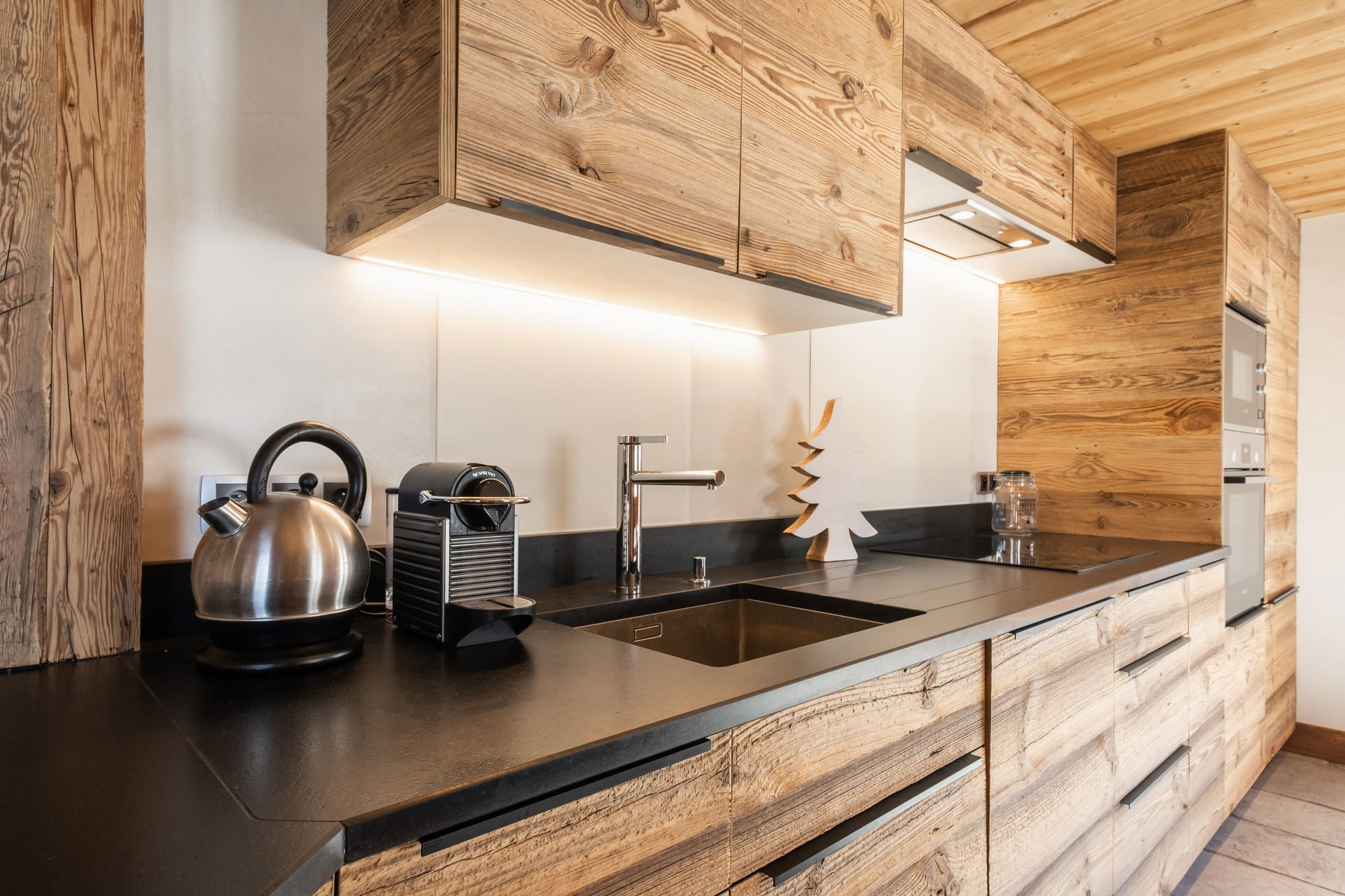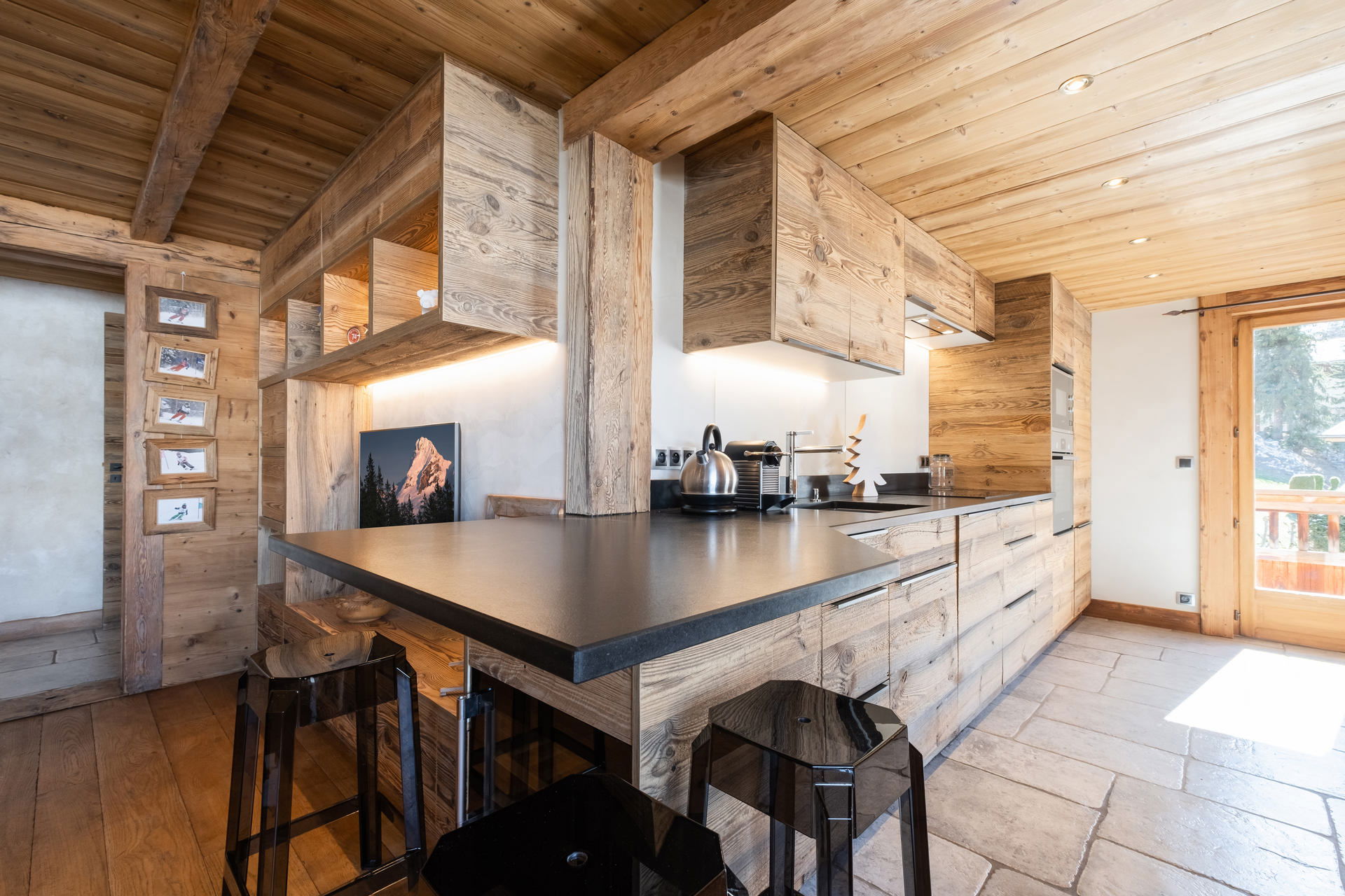 - CUISINE avec COIN REPAS (15.01 m²) : réfrigérateur + freezer (291 L), table INDUCTION, FOUR, MICRO-ONDES, LAVE-VAISSELLE, machine NESPRESSO, CAVE A VINS, fenêtre sud vue chalet voisin / montagne, porte-fenêtre est, accès balcon / terrasse sud-est, vue chalet voisin / montagne, porte-fenêtre ouest, accès balcon sud, vue chalet voisin / montagne