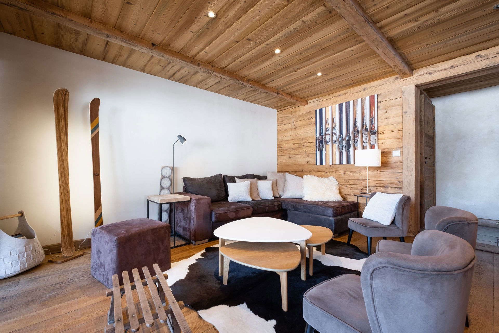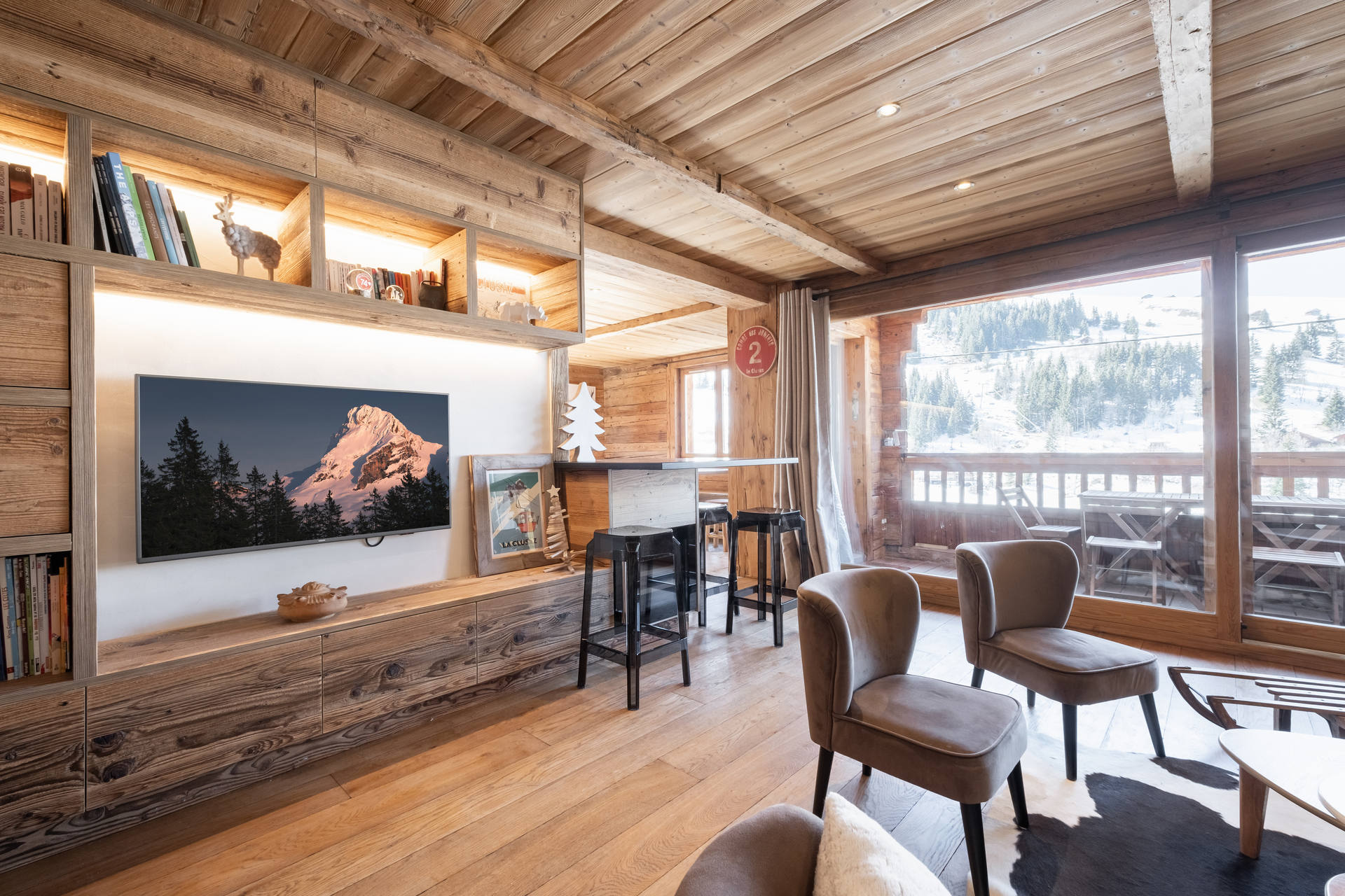 - SEJOUR (20.64 m²) : TV écran plat, baie vitrée, accès balcon sud, vue chalet voisin / montagne