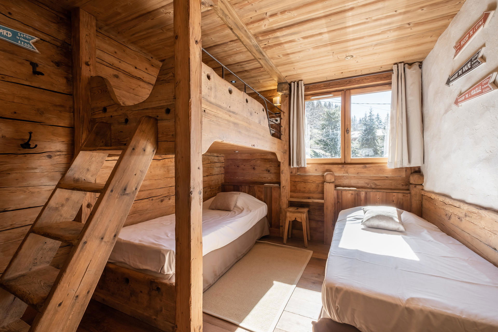 - CHAMBRE (10.27 m²) : 2 LITS SUPERPOSES (80) -> lit supérieur interdit -6 ans + 1 LIT 1 PLACE (80), petite TV écran plat, fenêtre est vue chalet voisin / montagne