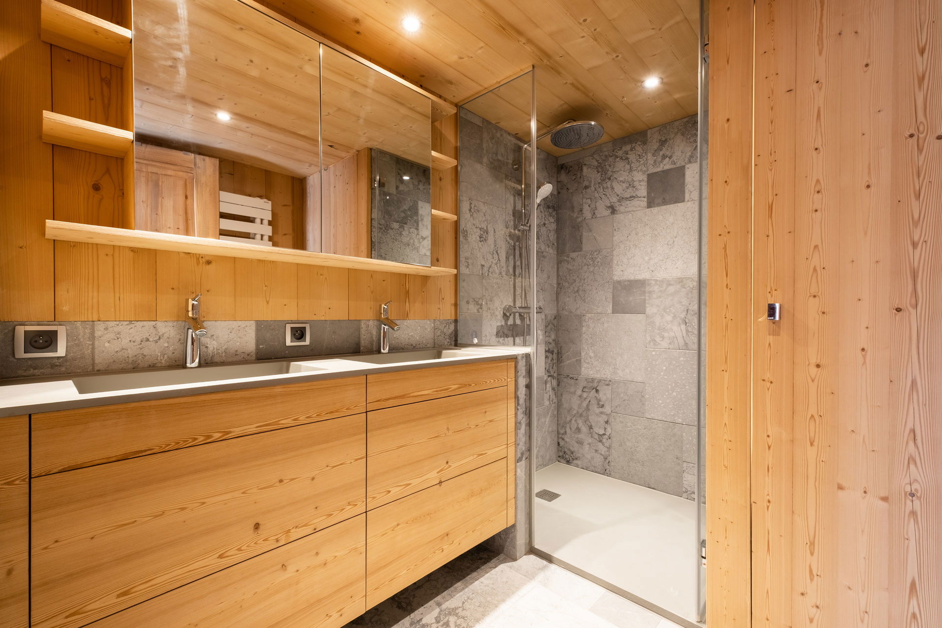 - SALLE D'EAU (5.09 m²) : douche, double vasque, radiateur SECHE-SERVIETTES, LAVE-LINGE, SECHE-LINGE