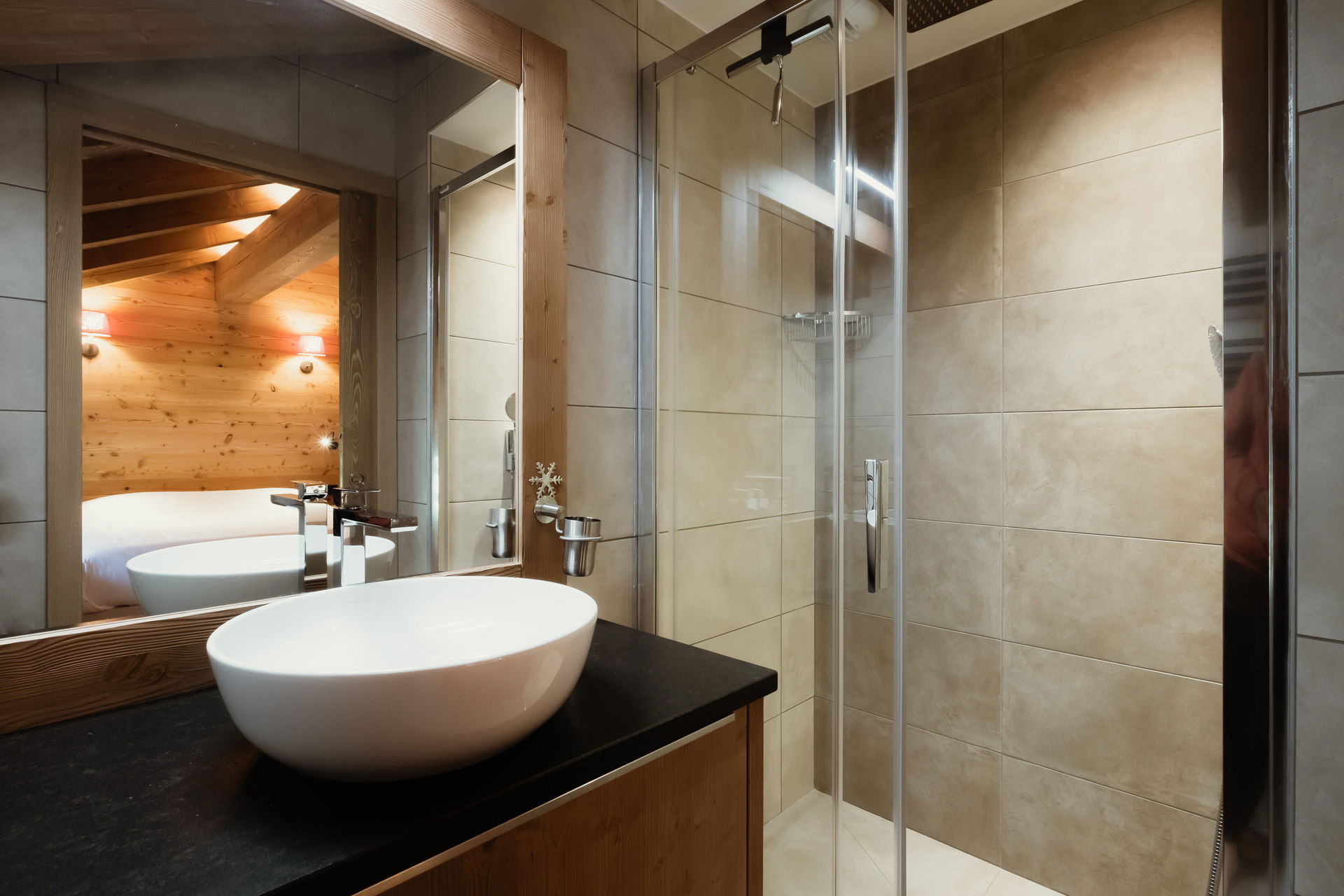 - CHAMBRE (12.61 m² dont 2.98 m² mansardés) : 1 LIT 2 PLACES (160 : 2 x 80 accolés), baie coulissante, accès balcon ouest, vue résidences voisines / montagne, vélux, SALLE D'EAU attenante (1.44 m²) : douche, vasque, radiateur SECHE-SERVIETTES