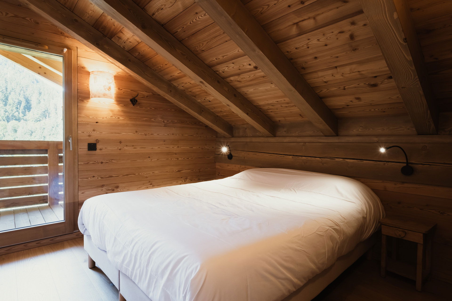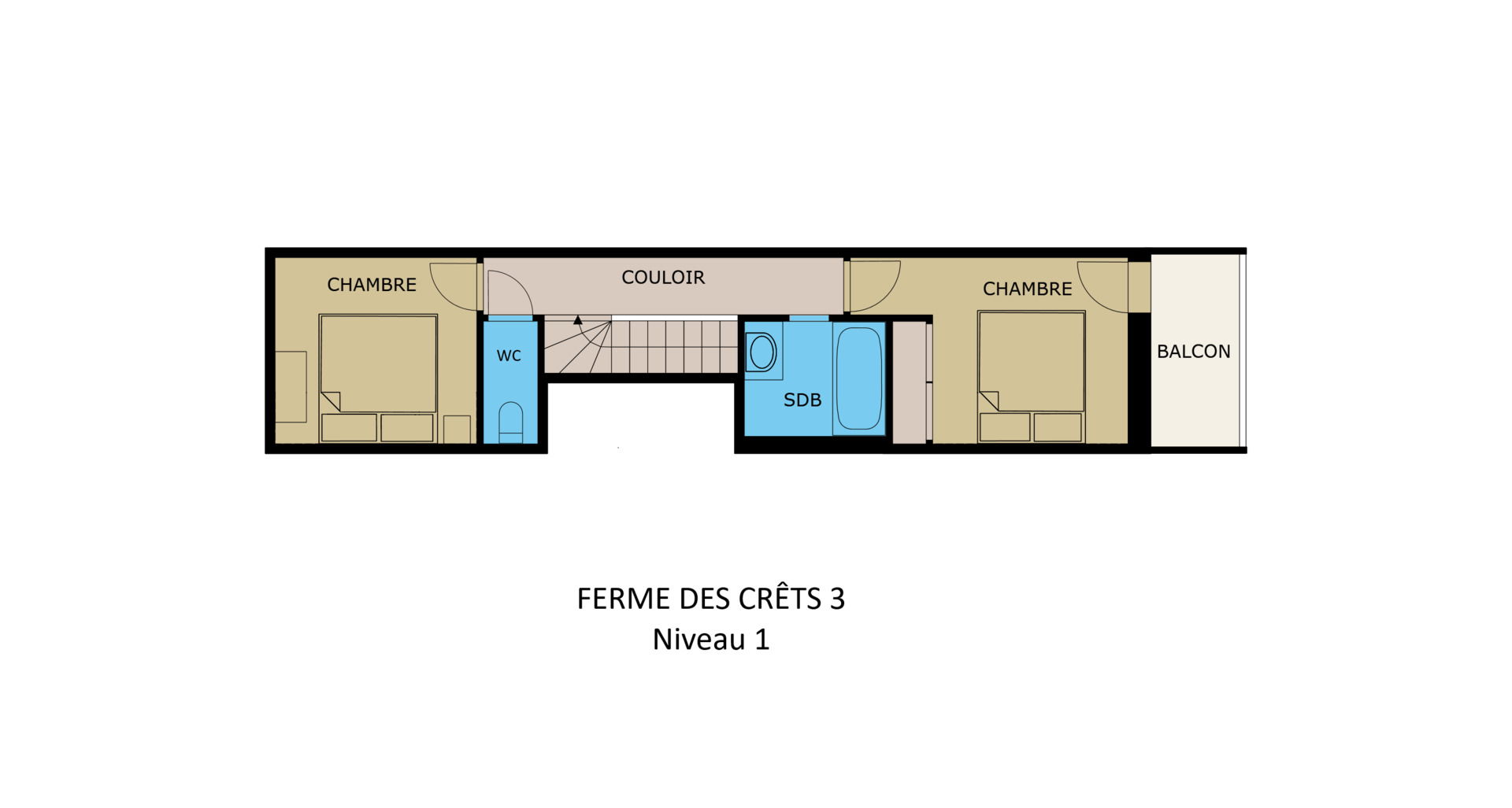 - CHAMBRE (10.91 m² dont 3.77 m² mansardés) : 1 LIT 2 PLACES (160 : 2 x 80 accolés), porte-fenêtre, accès balcon est, vue résidences voisines / montagne